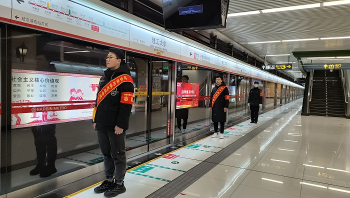青年志愿者來到哈爾濱地鐵“理工大學站”開展了志愿服務,他們身著禮儀綬帶、紅色袖標站在地鐵站的出入口、售票機、閘機口、上下站等位置,為乘客提供指引、咨詢、購票等一系列乘車服務,并開展了站內地面、墻面清潔工作。