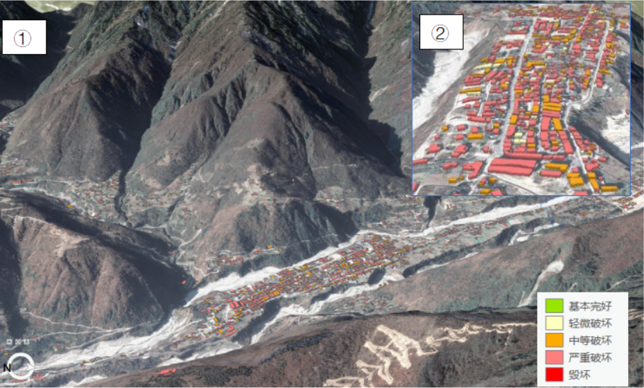 圖3 災(zāi)區(qū)建筑物震害評(píng)估結(jié)果(磨西鎮(zhèn)及其周邊,①為全景,②為放大圖)