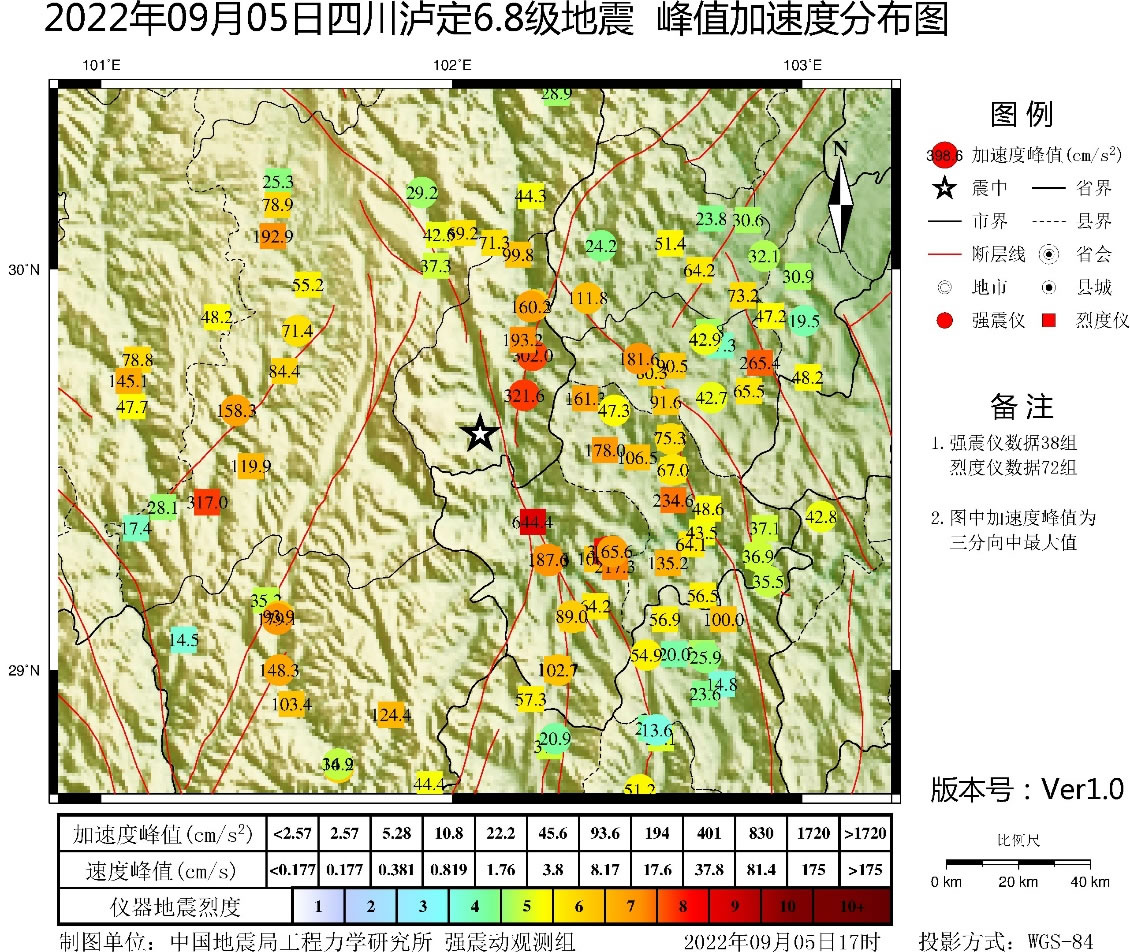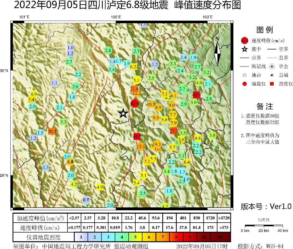 四川瀘定6.8級地震峰值速度分布圖(單位:cm/s)