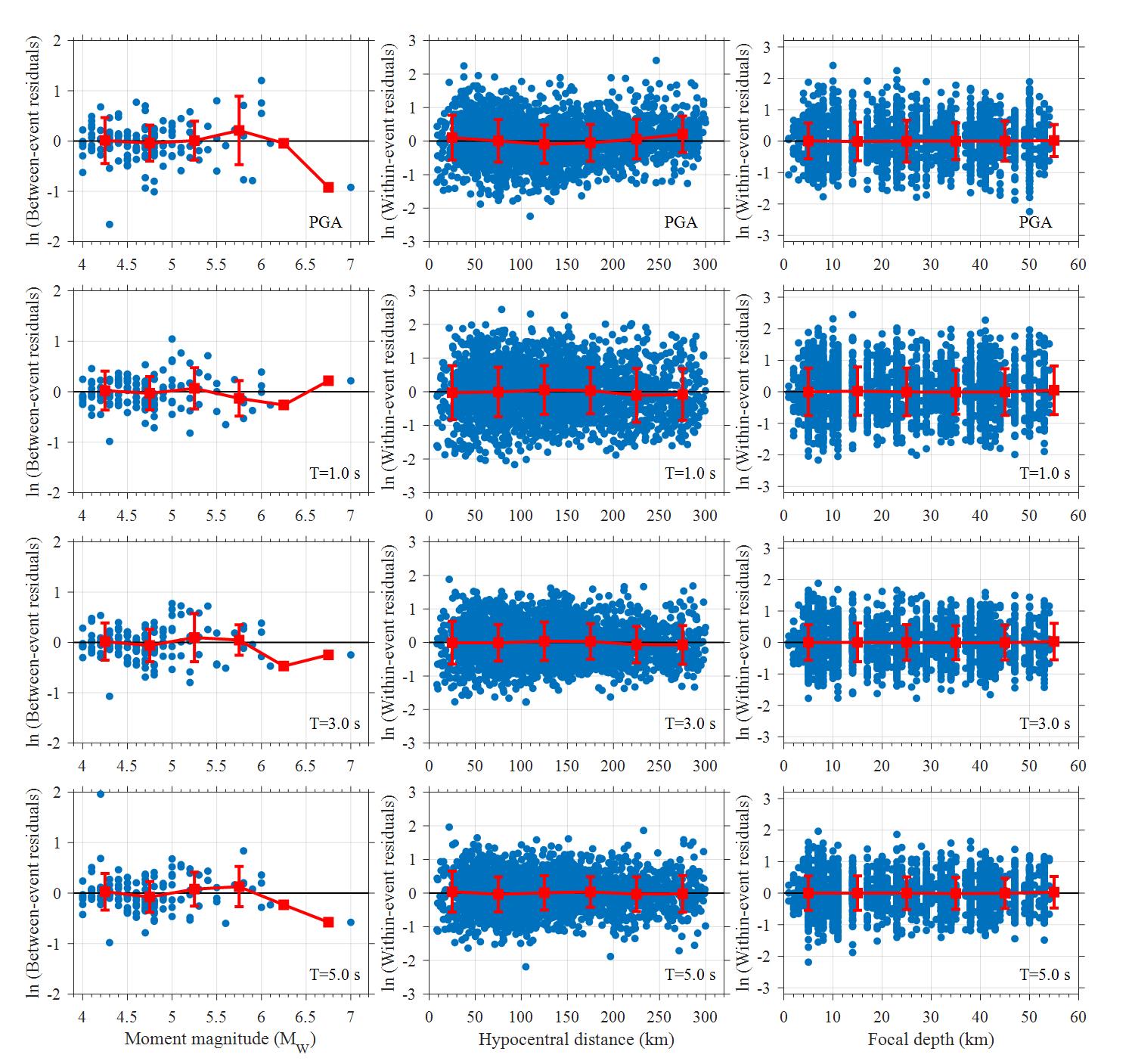 圖2 事件間殘差和事件內(nèi)殘差對(duì)震級(jí)、震源距離和震源深度的分布圖