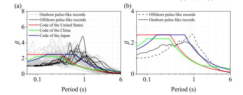 圖3 (a)陸域設(shè)計(jì)譜、海域和陸域脈沖型地震動(dòng)記錄的水平向歸一化反應(yīng)譜; (b) 陸域設(shè)計(jì)譜的水平向歸一化反應(yīng)譜與海域和陸域脈沖型地震動(dòng)記錄的水平向歸一化反應(yīng)譜的均值