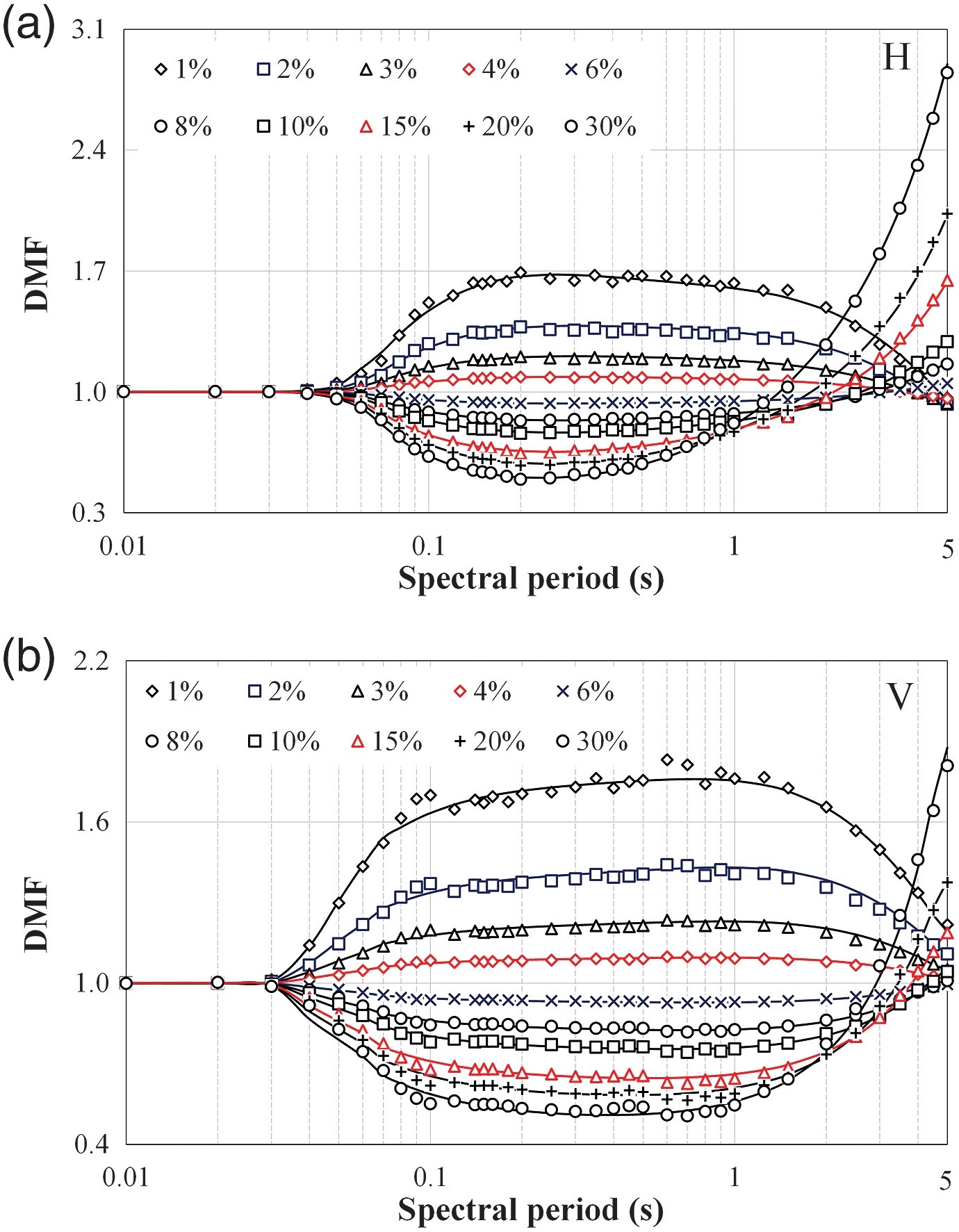 抗震規(guī)范設(shè)計譜以及地震動模型計算的反應(yīng)譜通常是基于5%阻尼比給出的。而海洋結(jié)構(gòu)的阻尼比并非5%,例如,海底沉管隧道、海底管道、海洋石油平臺、儲油罐、跨海橋梁等海洋工程結(jié)構(gòu)的阻尼比一般小于5%,裝有隔震支座的建筑和橋梁的阻尼比要大于5%。為得到相應(yīng)結(jié)構(gòu)阻尼比水平下的譜值,最常用方法是建立阻尼修正系數(shù)(DMF)模型,DMF可以在5%阻尼比反應(yīng)譜基礎(chǔ)上進行調(diào)整得到其他阻尼比水平的反應(yīng)譜。