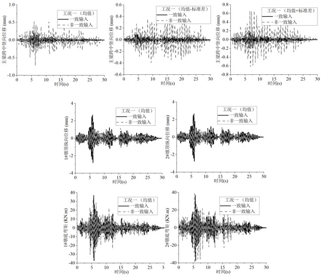 地震動的頻域非平穩(wěn)性可通過累積穿零量隨時(shí)間變化進(jìn)行描述,在傳統(tǒng)譜表達(dá)合成地震動的基礎(chǔ)上分別引入相位差譜和累積穿零量對合成結(jié)果進(jìn)行強(qiáng)度、頻域非平穩(wěn)化。利用CESMD數(shù)據(jù)庫中豐富的地震動記錄擬合出相位差譜隨震級、震中距變化模型,以及累積穿零量隨時(shí)間變化的經(jīng)驗(yàn)?zāi)P?,再代入空間相干函數(shù)拓展為多點(diǎn)非平穩(wěn)地震動,改進(jìn)后方法流程如圖1。由圖2可知,所模擬的地震動時(shí)程不僅具有強(qiáng)度及頻域非平穩(wěn)性,同時(shí)體現(xiàn)了空間多點(diǎn)的相干性。將上述合成的地震動通過一大跨橋梁進(jìn)行多點(diǎn)地震動輸入驗(yàn)證,討論了一致和非一致輸入下的結(jié)構(gòu)響應(yīng)差異。