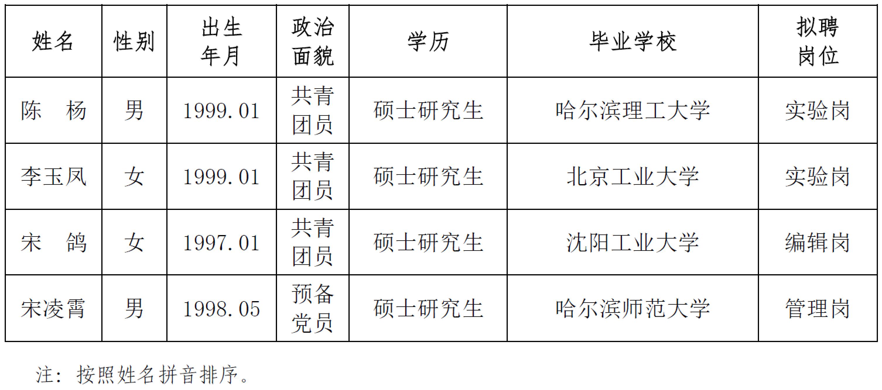 發布時間: 2024-05-14 點擊數量:13879根據中國地震局《關于貫徹執行〈事業單位公開招聘人員暫行規定〉的通知》文件精神和我所用人計劃,經公開發布招聘信息、資格審查、面試等程序確定擬錄人員。現將擬錄人員相關情況公示如下,公示期7個工作日,期間如有異議請與中國地震局工程力學研究所人才資源部或紀檢室聯系,以個人名義反映情況的領署真實姓名,以單位名義反映情況的須加蓋公章。