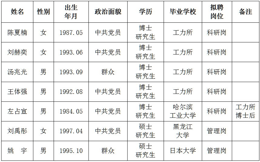 發布時間: 2022-05-30 點擊數量:11829根據中國地震局《關于貫徹執行〈事業單位公開招聘人員暫行規定〉的通知》文件精神和我所用人計劃,經公開發布招聘信息、資格審查、面試等程序確定擬錄人員。現將擬錄人員相關情況公示如下,公示期7天,期間如有異議請與中國地震局工程力學研究所人才資源部或紀檢室聯系,以個人名義反映情況的須署真實姓名,以單位名義反映情況的須加蓋公章。